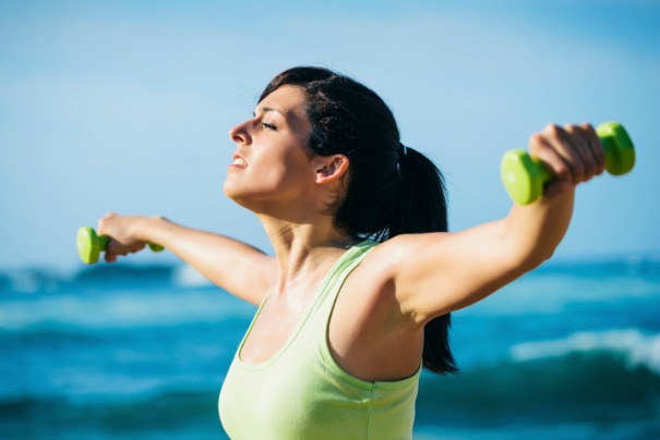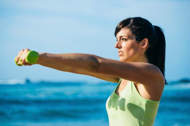 This week’s workout focuses on building strength in your shoulders. Shoulder Razors are great because they build muscle in your shoulders, triceps, laterals and trapezius (the muscles around your upper back and neck). You can use weights for this exercise—try 5-10 pound dumbbells (depending upon your strength), or some canned fruit or heavy books will work just as well.
