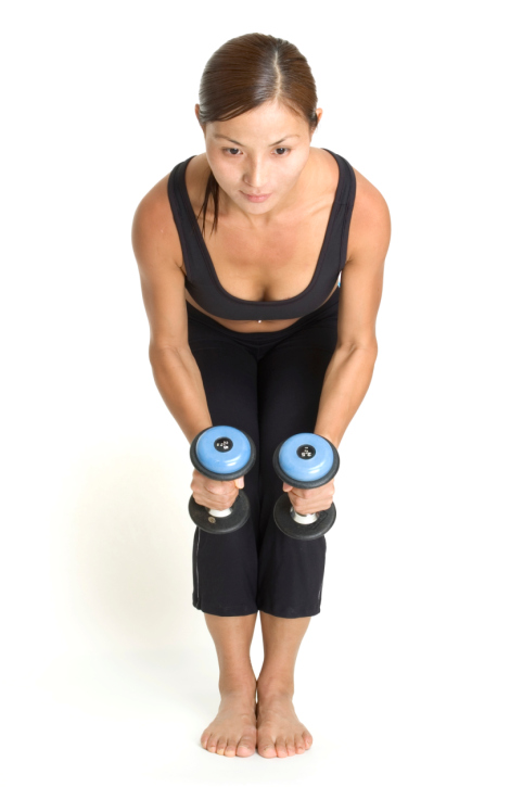 - Slowly lean forward, sticking your chin and your chest out. Keep your eyes straight ahead—this will help you from putting any unwanted strain on your neck. Let your arms come forward and bend your elbows so the weights are parallel with your chest. This will be your starting position.