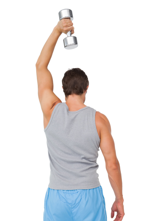 Whichever hand you are holding the weight in, slowly lift the weight by bringing your arm up over your head, holding the weight above you.